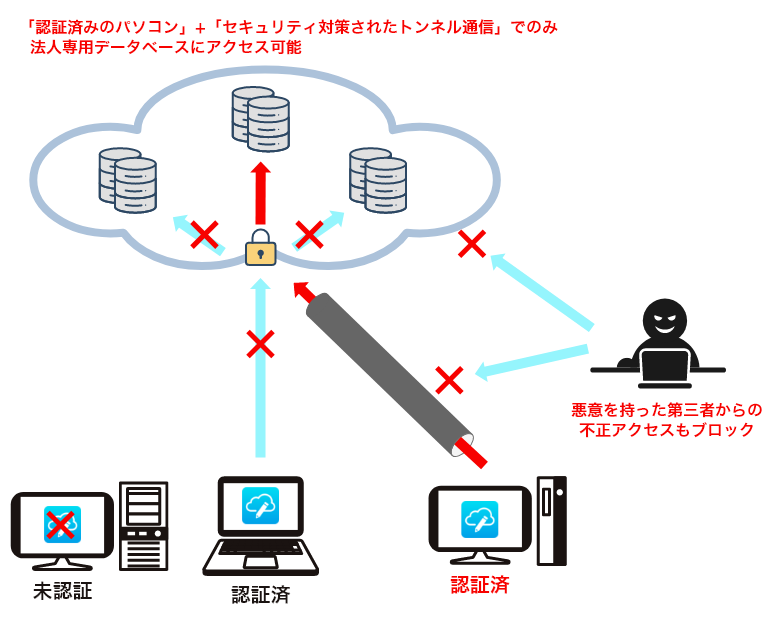 認証済のパソコンからしかアクセスできません。専用のVPNによる通信のため悪意のある第三者からの不正アクセスを防ぎます。