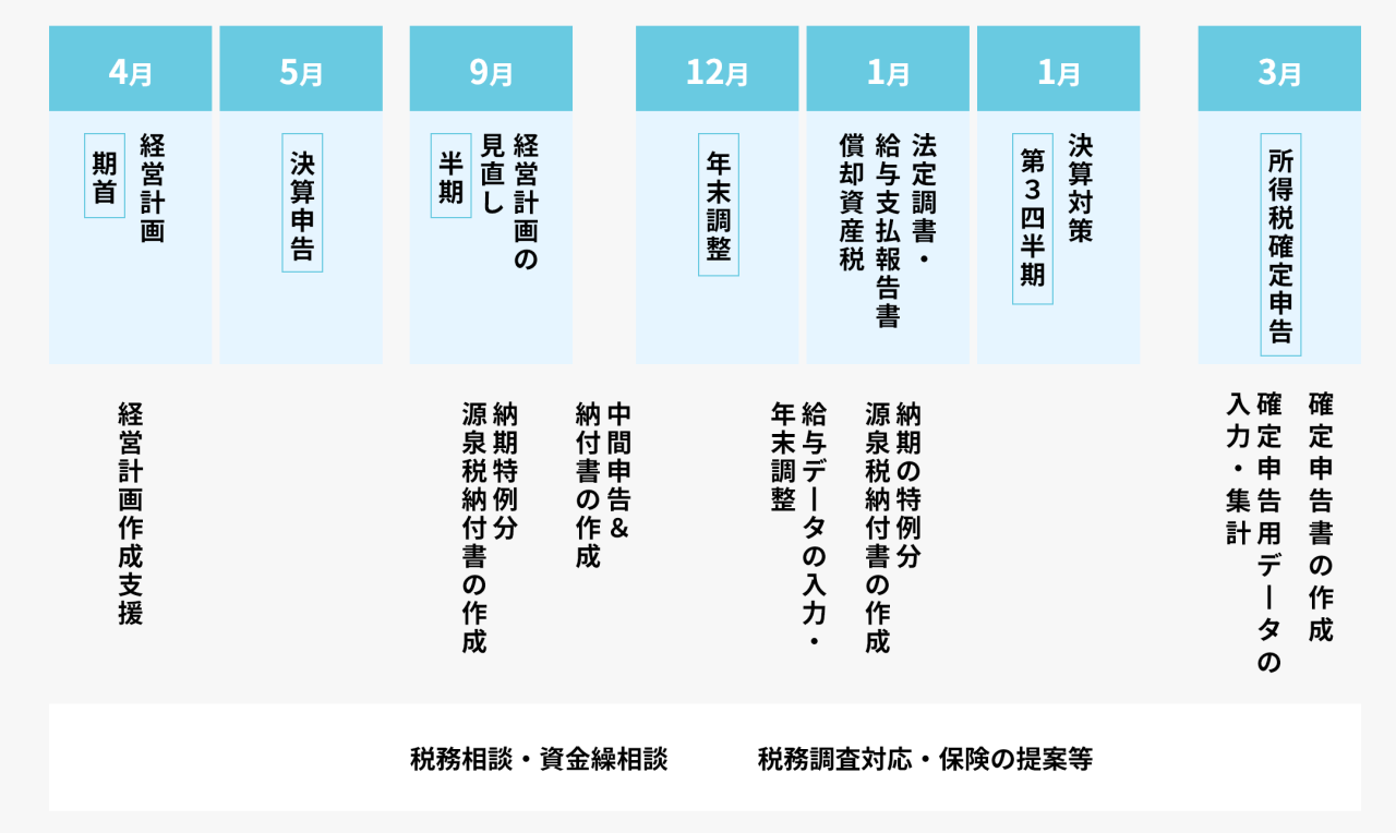 お客様の規模やニーズによって、業務の違いはありますが、決算までの基本的な業務の流れは下記のとおりです。