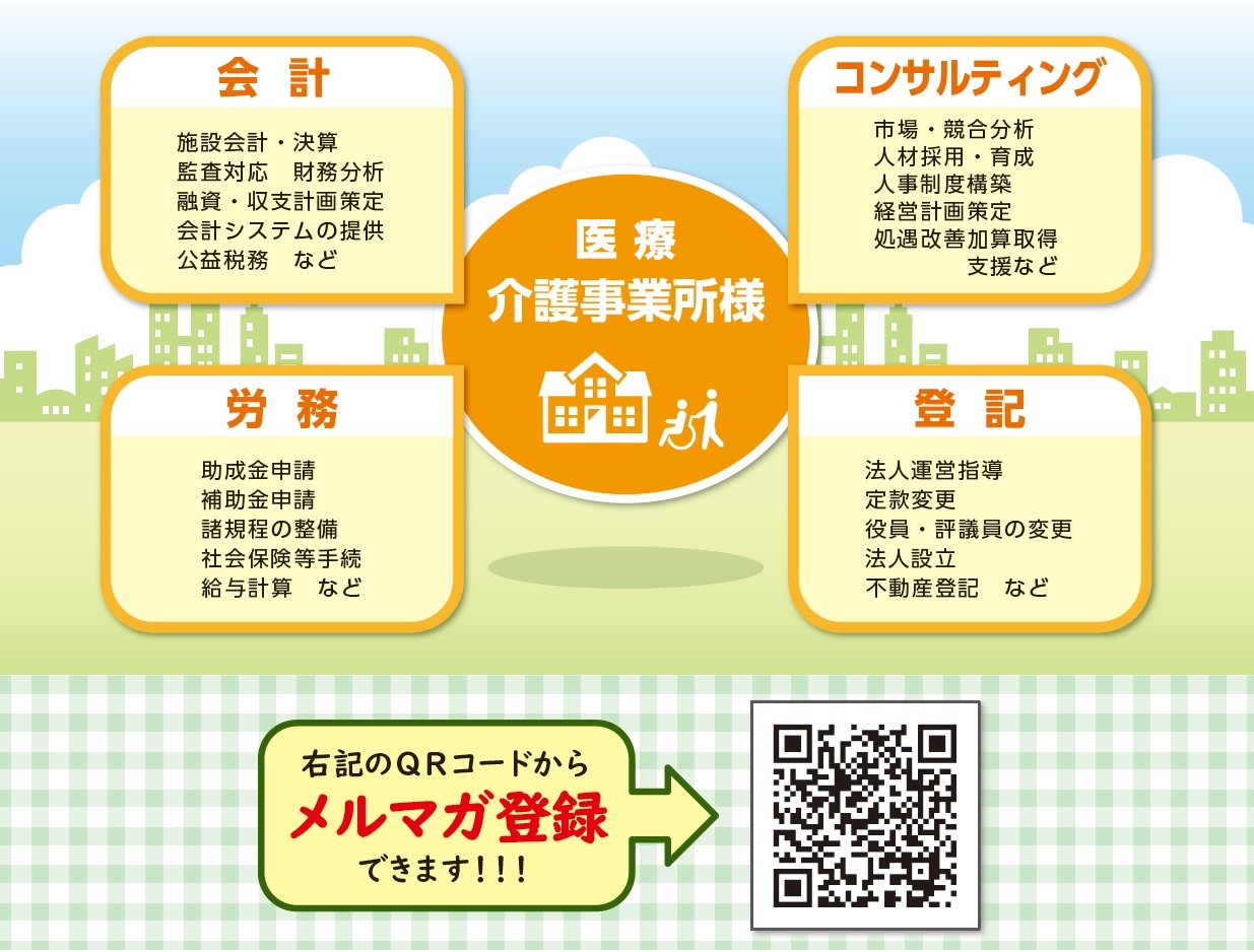 公認会計士・税理士・社会保険労務士・中小企業診断士(コンサルタント)・司法書士・行政書士などの専門家が、医療・介護・障がい者福祉業界に関するホットな情報を、詳しい解説付きでお届けするサービスです。