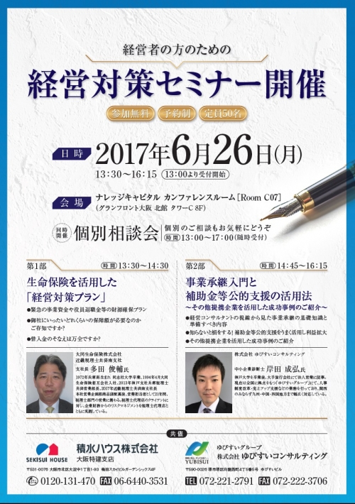積水ハウス株式会社、株式会社ゆびすいコンサルティング共催で、経営者の方のための経営対策セミナーを