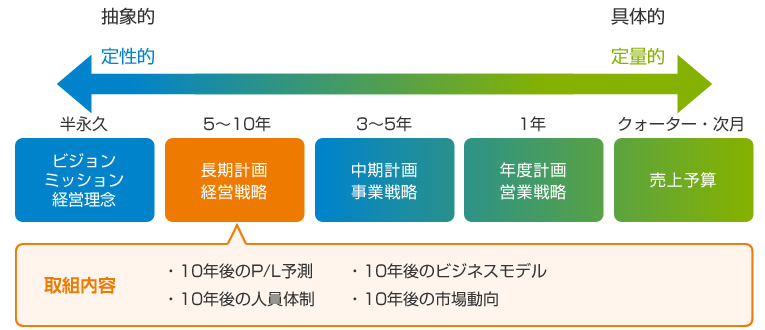 現在の日本の企業の風習として、経営理念はあるけれどそれが注記改革や年度計画・営業戦略に落ち込んでいないという事例が非常に増えてきています。経営理念やミッション・ビジョンが今現在の事業と繋がりを持たない理由として、長期計画や経営戦略の不足が問題であると私共は考えています。