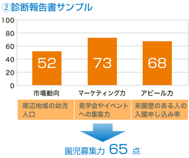 弊社コンサルタントが貴園をご訪問し、診断項目に沿って貴園の園児募集力をチェックします。その後約2週間で、診断結果を集計・分析し、現状の問題点・課題・弊社からのご提案をお伝えします。