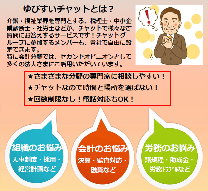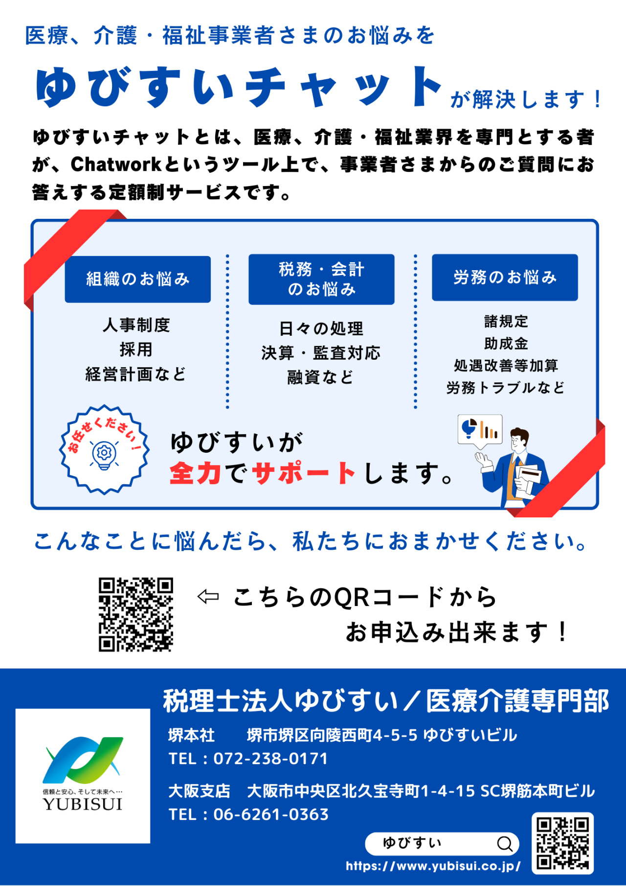 ◎介護事業所さま向けメルマガの登録(無料)はこちら⇒https://p.bmb.jp/bm/p/f/tf.php?id=ntxkc271&task=regist ------------------------------------------------------- 連絡先: ゆびすい医療介護専門部 門原(かどはら)&岸田 TEL:072-238-0171 FAX:072-222-0175 〒590-0026 大阪府堺市堺区向陵西町4-5-5 ゆびすいビル -------------------------------------------------------